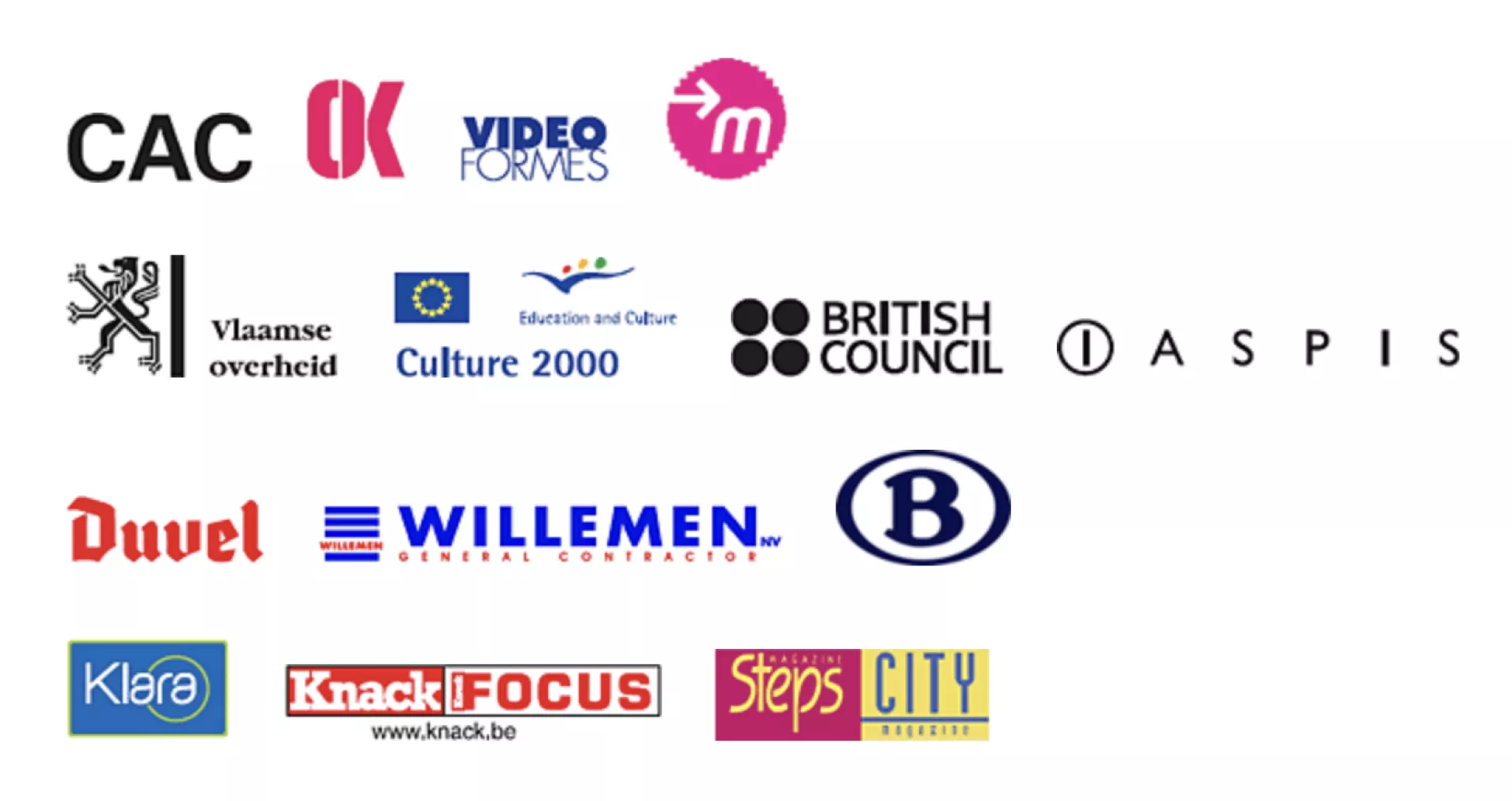Vlaamse Overheid, Europa - Cultuur 2000, CAC, OK Centrum, Videoformes, EMAF, British Council, Iaspis, Duvel, Willemen Groep, NMBS, Klara, Knack Focus, Steps City Magazine.