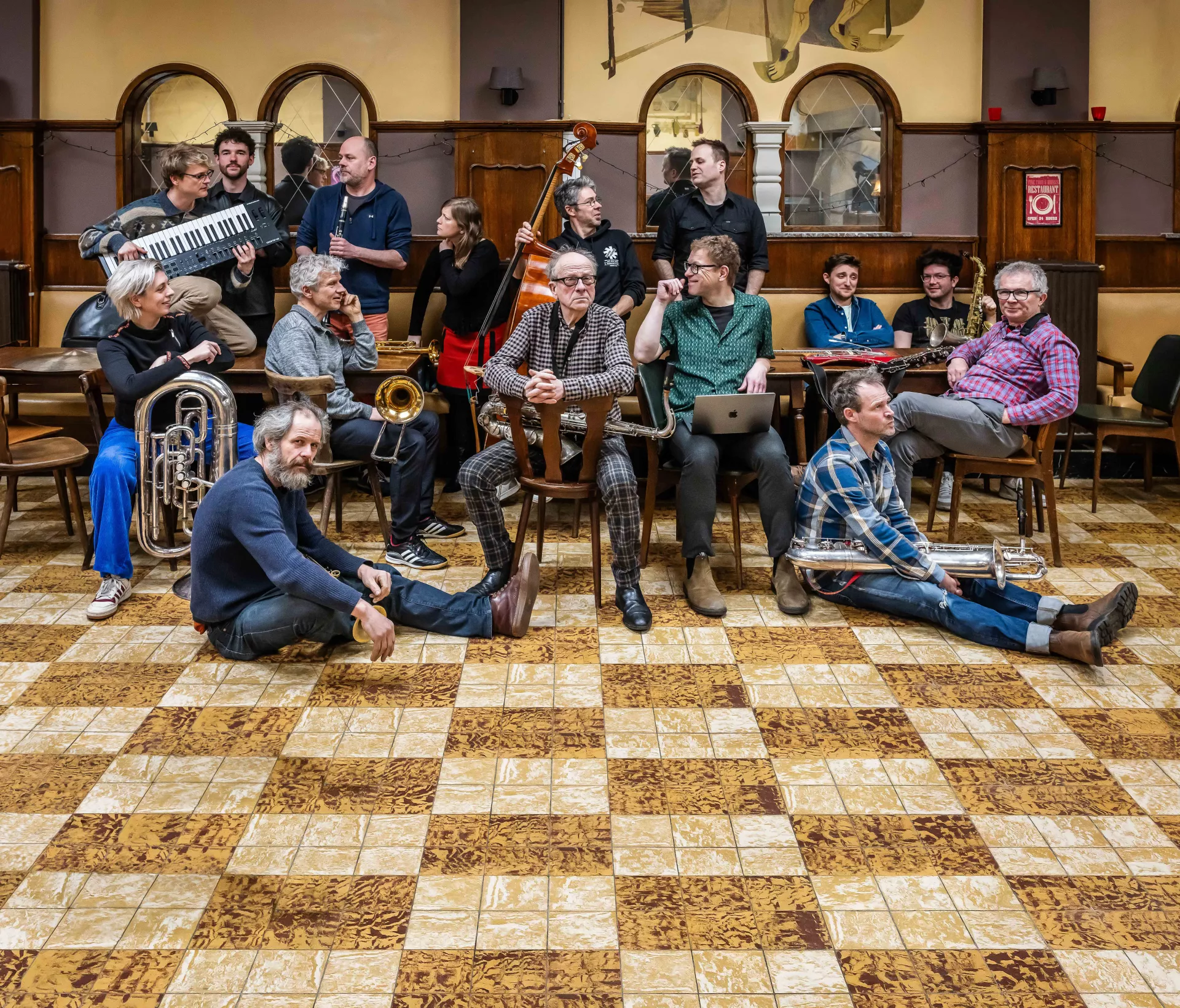 Drums: Gert-Jan Dreessen • piano & keyboards: Peter Vandenberghe • contrabas: Cyrille Obermüller • gitaar: Maarten Flamand • vibrafoon: Wim Segers • trompet: Bart Maris, Pauline Leblond • trombone: Peter Delannoye, Marc Meeuwissen • tuba: Berlinde Deman • klarinet, basklarinet, elektronica: Peter Vermeersch • klarinet, basklarinet: Martí Melià • baritonsaxofoon, fluit: Bruno Vansina • altsaxofoon: Benjamin Boutreur • tenorsaxofoon: Michel Mast • beeld © Bas Bogaert