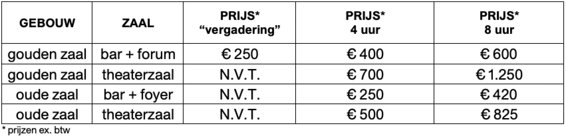 Details en prijzen zaalhuur